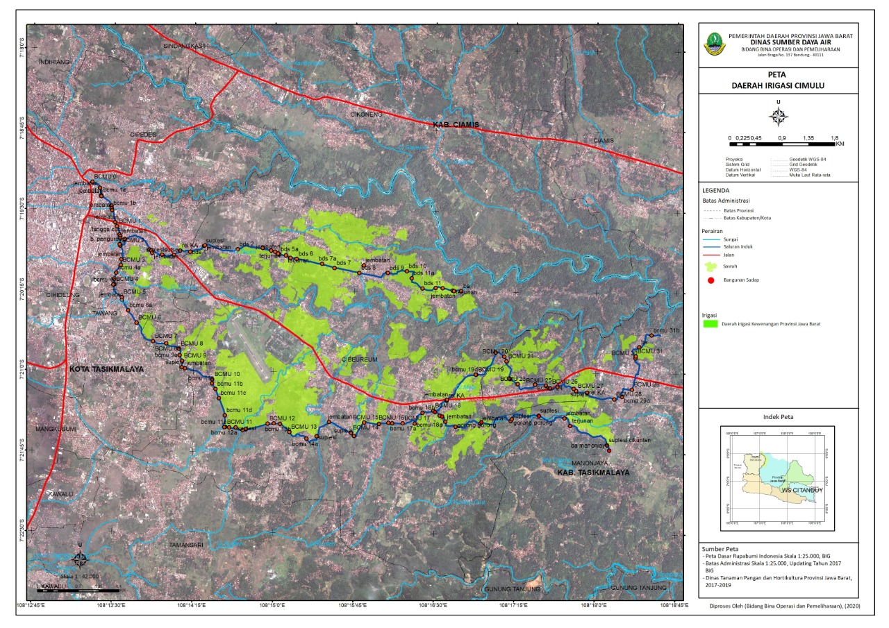 Daerah Irigasi Cimulu merupakan Irigasi Lintas, yang melintasi Kabupaten Tasikmalaya dan Kota Tasikmalaya mengairi areal potensial hasil perencanaan A = 1559 Ha, meliputi : Kota Tasikmalaya A = 1067 Ha dan Kabupaten Tasikmalaya A = 492 Ha,. Irigasi Cimulu pembangunan konstruksinya dimulai jaman Belanda pada tahun 1918 dan untuk operasi pemeliharaannya masih berjalan sehingga diharapkan Jaringan Irigasi Cimulu berfungsi secara keseluruhan ( untuk mengairi areal sawah seluas 1559 Ha ). Peta Daerah Irigasi dan Peta lokasi Bendung Cimulu, dapat digambarkan sebagai berikut :