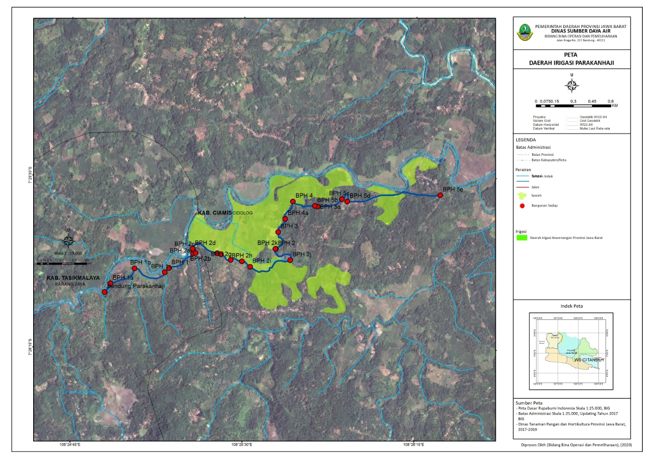 Daerah Irigasi Parakan Haji secara administratif lokasi bangunan utama terletak di Desa Sirna Jaya, Kecamatan Karang Jaya, Kabupaten Tasikmalaya, secara geografis astronomis terletak di koordinat 7° 26.011'S, 108° 24.894'E Saat ini, sumber air DI. Parakan Haji berasal dari Sungai Ciseel yang dialirkan melalui Bangunan Utama Free Intake untuk melayani kebutuhan air persawahannya yang terletak di kanan sumber air. Pada kesempatan kali ini tim dari Bidang Perencanaan Teknik bersama dengan tim dari UPTD PSDA WS Citanduy berkesempatan untuk melaksanakan Survei ke D.I Parakan Haji Kabupaten Tasikmalaya. Peta Daerah Irigasi dan Peta lokasi Bendung Parakanhaji, dapat digambarkan sebagai berikut :